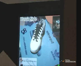 KIOSK 的使用,这次有两个不同的全新体验,第一个是一般图片连结到新款鞋子还可以手动选择颜色。第二个结合脸部识别抓取脸部照片结合内建卡通人物体验动态舞蹈动作。